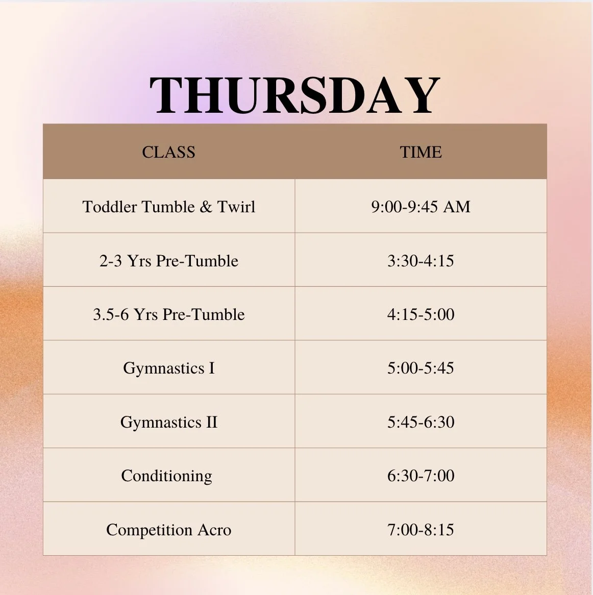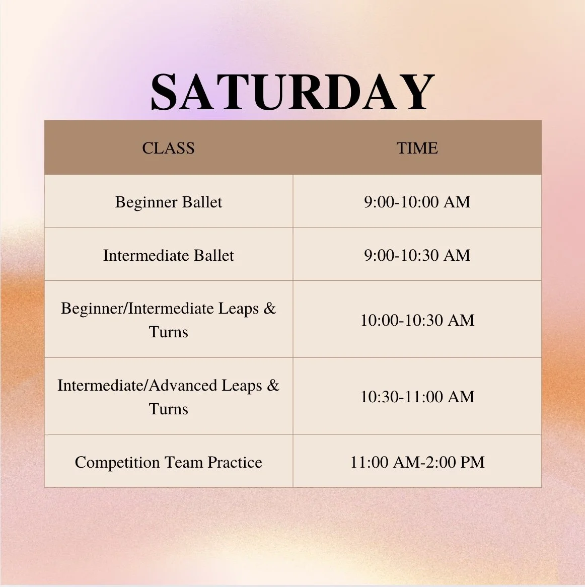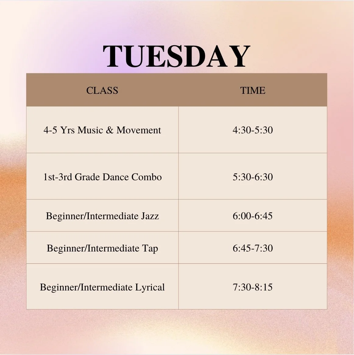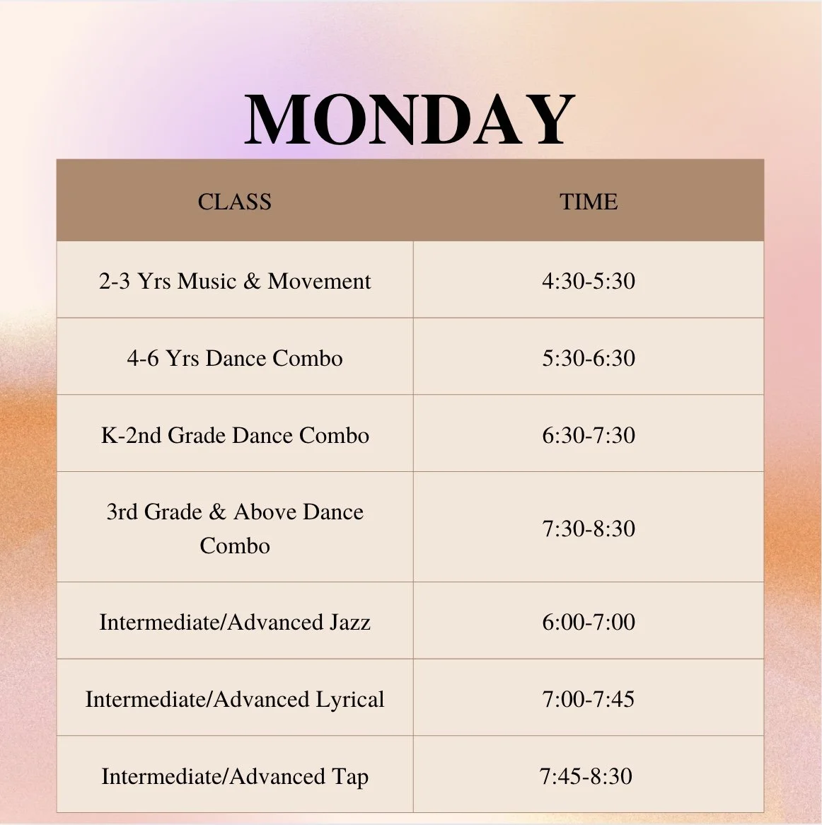 25-26 Dance Class Schedule